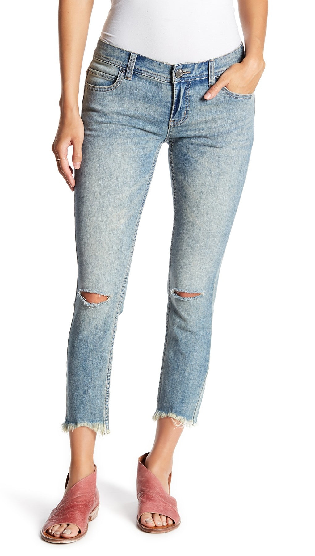 The Destroyed Skinny Jeans in the Sitka wash from Free People collection are a skinny silhouette cropped length denim pant with a frayed hem and destructed detailing. These stylish low rise jeans feature destroyed slits, frayed details, and a perfect blue wash. Distressed skinny crop jeans with destroyed tears at each knee and destroyed ankles. 5-pocket style. Zipper and button fly closure. Bottom hems are raw edge and lightly frayed. Stretchy fit. The ripped knees and frayed, cropped hems define the had-'em-forever character of skinny jeans faded to a perfectly worn-in light blue hue.