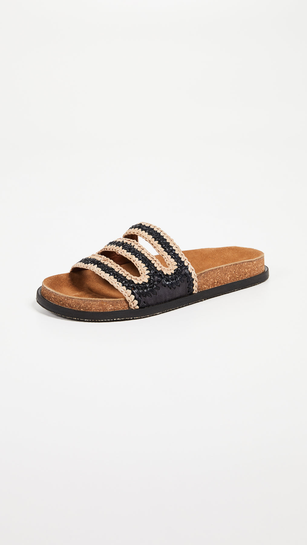 These leather slip-on sandals are the Crete footbed flats from Free People shoes in black. Molded cork footbed and braided woven raffia & nubuck on the upper with cut-outs these easy slip-on wear slides have an open toe silhouette and leather lining, the two-tone woven straps enhance
