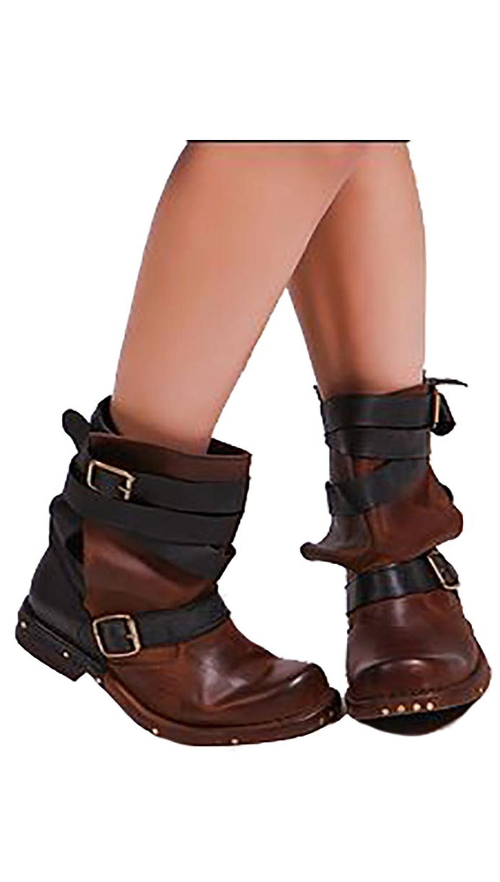 These distressed leather boots from Jeffrey Campbell feature a buckled belt wrap strap at the ankle and a wraparound, buckled strap at the split shaft. The Jeffrey Campbell Rouges Boots are made of genuine two tone leather, the front half is brown leather and the back half is a contrasting black leather which matches the black wrapped straps. These moto biker inspired boots have seam and nail-head details, featuring metallic gold nails along the bottom sole for added design detail. Stacked heel and rubber sole. The perfect no nonsense rugged boot for the girl with some edge.