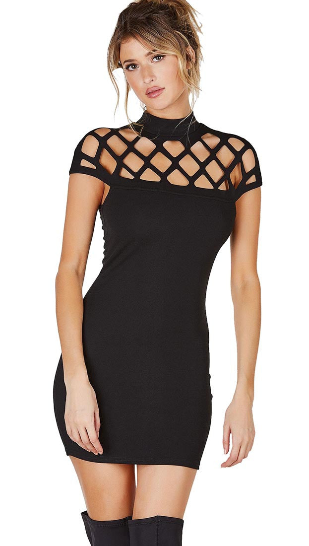 Caged Cut Out High Neck Mini Short Sleeve Dress Black - Makers of Dreams